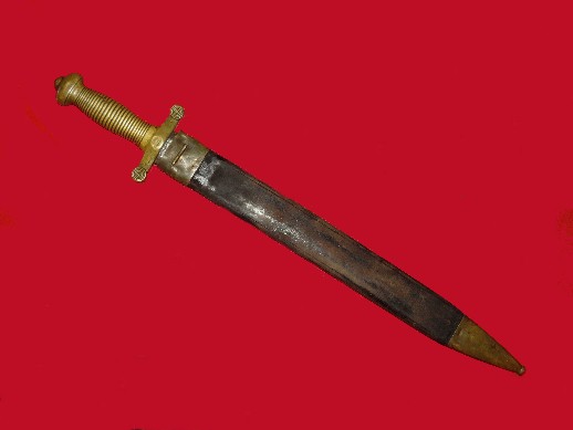 2. Very nice condition, Confederate carried, Model 1832, French Artillery short sword and  original leather scabbard.  The Confederacy imported a good number of these, and the Confederate manufacturer, E. J. Johnson, actually copied this French pattern in making his Confederate swords.  This particular sword is out of a north Alabama estate.--$495.