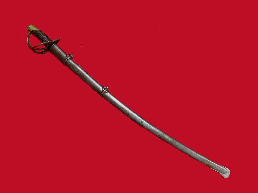 24. Model 1850, Federal Field & Staff Officer's sword in original, brass mounted metal scabbard.  The blade on this officer's sword was at some point in time plated and has residue of old plating remaining today.  The cast brass guard remains in nice condition with a good bit of original gold gilt still visible.  The grip remains very nice with original shark skin wrap and wire.  The metal scabbard remains in nice condition as well and also has residue of old plating.  Over the years, I have discovered that a good many Civil War guns and swords that were plated were on display in old GAR meeting halls and UCV meeting halls.  Their thinking apparently was, if we plate them, we won't have to keep cleaning them.  This is a very attractive sword and scabbard with the cut-out "US" in the guard.--$950.