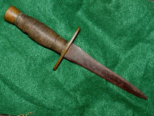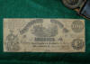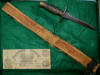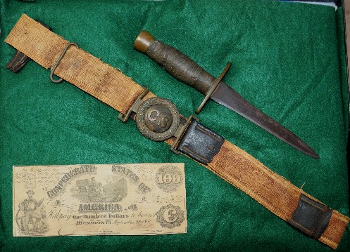8. Absolutely drop-dead beautiful, Richmond Arsenal CS sword belt plate on original leather tipped, cream colored canvas, Confederate manufactured linen belt.  These are among the rarest Confederate sword belts to encounter.  Along with the Confederate sword belt and buckle comes a Confederate dagger made from a Kenansville Confederate sword.  There is a $100 Confederate States of America note dated September 2, 1861.  This entire grouping was purchased many, many years ago from a Richmond, Virginia, estate by Jim Brandon.  This type linen waist belt is one of the very rarest to encounter.--$11,500.  (complete with Kenansville side knife and $100 note)SOLD