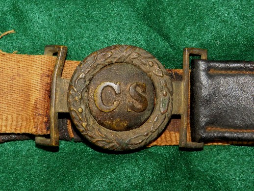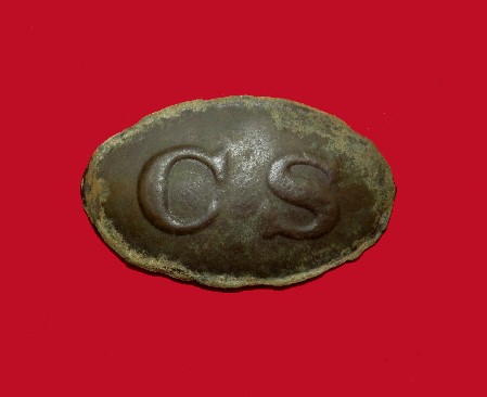 24. Excavated Leech and Rigdon "CS" sword belt plate.  This buckle was recovered about 30 years ago from General Forrest's Confederate Cavalry camp located along Tippa Creek in North Mississippi.  The buckle has a good fit, and matching patina, and was recovered together, but it appears that the original wreath had broken and a replacement had been found.  The replacement wreath fits well, but does have a little bit heavier belt loop than the tongue.  Other than that, it fits perfectly, and was being worn that way.  The buckle has a very pleasing display look.--$2,450.