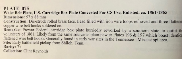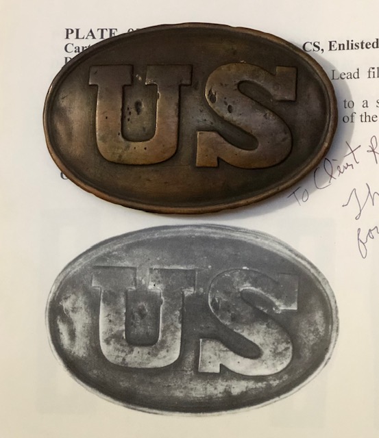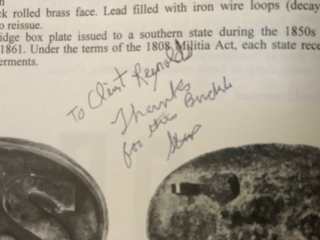 1. SUPER, SUPER RARE, Noble Brothers, Rome, Georgia, Confederate alteration of a US oval cartridge box plate to a Confederate waist belt plate that would have been worn "upside down" to read, "SN" (Southern Nation).  This particular example is THE VERY ONE pictured in Steve Mullinax's, Confederate Belt Buckles and Plates on page 48.  Steve personalized the picture of the buckle in Clint's book "Thanks for the buckle - Steve".  In over 50 years, I have seen less than five of these type Confederate conversions that are NON-EXCAVATED.  This buckle is not only in drop-dead perfect condition with all three applied Confederate hooks intact, but also comes with Steve's original buckle book with the personalization inside.  It does not get better than this.--$1,450.SOLD