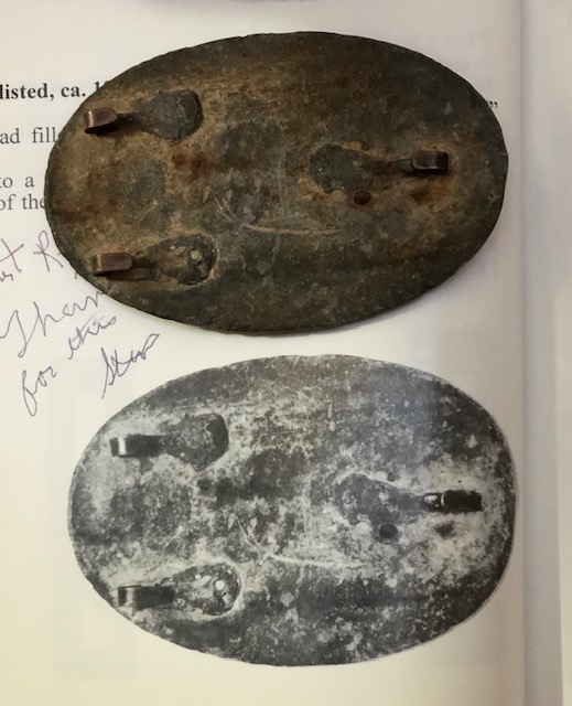 23. Absolutely drop-dead beautiful excavated condition.  This is a regulation, large oval, lead-filled, US buckle with "arrow style" hooks.  It was recovered on private property among the limestone out-croppings here at Stones River about 40 years ago by Wade Buchanan.  I do not think you could recover a more beautiful, perfect buckle.--$325.