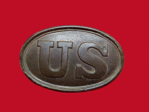 88. Excellent condition, non-excavated, large size, US oval cartridge box plate.  This plate measures 2 1/2 inches between the attachment loops.  If you happen to have a Federal cartridge box needing a cartridge box plate, you won't find one prettier than this one.--$250.