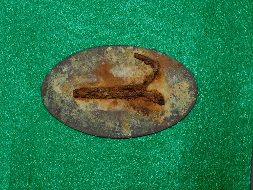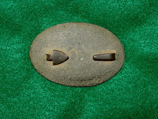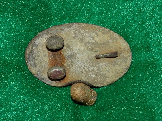 103. Beautiful condition, excavated, lead-filled, large size US oval cartridge box plate.  This plate was recovered many, many years ago on private property here at the Battle of Stones River.  You couldn't ask for a more beautiful excavated cartridge box plate.  The face has a near reflective brown/green patina, and the reverse has full lead with both iron loops remaining perfectly intact.  This is a beauty!!!--$250.