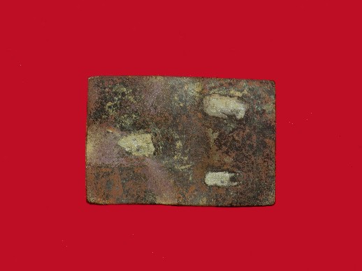 28. Excavated, clip-corner, sheet brass, plain face, Confederate rectangular waist belt plate.  This plate was recovered many years ago on private property at Ft. Donelson, Tennessee.  These type buckles are carried over from use in various Militias, and their use gradually fades away in later years of the Civil War.  It has a smooth, chocolate patina, and the hooks are missing which is why the plate was likely discarded.--$325.