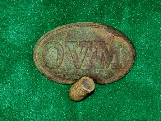 1. Absolutely beautiful face on this excavated, large size, lead-filled, "OVM" (Ohio Volunteer Militia) cartridge box plate.  This cartridge box plate was recovered about 40 years ago from an Ohio Infantry camp located near Decherd, Tennessee.  I actually dug a matching OVM buckle to this box plate about 50 feet away.  This will be a centerpiece to someone's Ohio display.--$2,450.