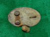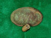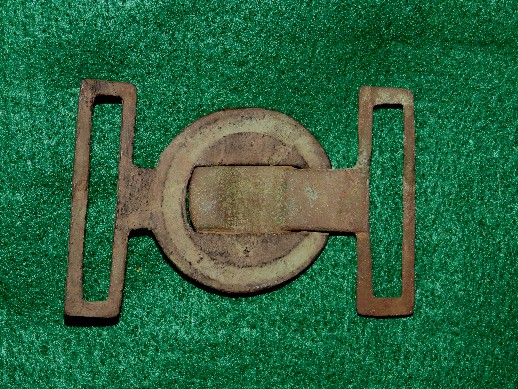 26. Excavated, cast brass, small "Lions Head" Confederate used buckle.  These buckles were imported from England and issued to Confederate forces.  This buckle is "small size" and had only about a 3/4 inch wide belt.  I recovered one of these exact same type buckles in a larger (and wider) "waist belt" size.  The entire buckle had "two" lion's head discs attached with an "s" shaped brass attachment hook.  One end of the hook was open, and actually hooked and unhooked.  The other end was closed, and stayed with that half of the buckle.  It worked much the same as the English snake buckle.  I recovered mine from a Jan. to June - 1863 Army of Tennessee camp along Duck River near Shelbyville, Tenn.  This is a rare style buckle to recover.  I have only seen about a half dozen of these type buckles recovered in all these years.--$150.SOLD