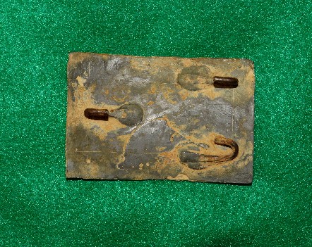 6. Excavated, nice condition, large oval, "puppy paw" hook pattern, lead-filled US waist belt plate.  This buckle was recovered here at Stones River by Wade Buchanan from the wooded area and rock out-croppings along Stones River near the current "Bumpus Harley Davidson" building.  The buckle remains virtually nice enough to wear due to having been recovered about 40 years ago.--$325.SOLD