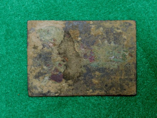 26. Excavated, stamped brass, plain face, rectangular, Confederate waist belt plate.  These are recovered from early war Confederate sites.  It is quite rare to recover one of these with most of the iron frog hooks still intact on the reverse.  My very first Confederate plate to recover back in 1969 was a plain face rectangle just like this one.  I recovered it from a Confederate camp site near Chickamauga, Georgia.  This is a really nice example.--$375.