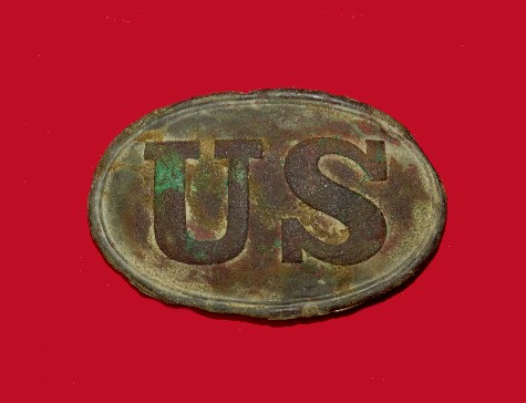 120. Excavated, large size, lead-filled, US oval waist belt plate.  This plate originally had iron capped stud hooks, and the iron caps have decayed away.  This is a very pretty excavated early pattern US oval and was recovered many years ago on private property near Shiloh.--$295.