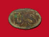 121. Beautiful condition, non-excavated, large size, US oval cartridge box plate.  This plate has a nice, uncleaned, bronze patina on the face with full lead in the reverse and both wire loops intact.  The wire loops on this plate are 2 1/2 inches apart, if you have a Federal cartridge box needing a box plate.--$250.