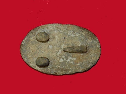 74. Drop-dead beautiful condition, excavated and has never even been washed off, large size, lead-filled, US oval cartridge box plate with full lead and both iron attachment loops remaining intact.  This box plate was recovered from an old oak woods camp near Chancellorsville, Virginia.  Plates this nice are just not being recovered at this point in time.--$250.