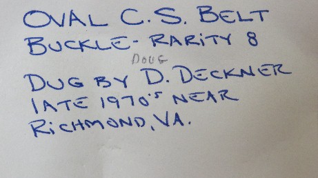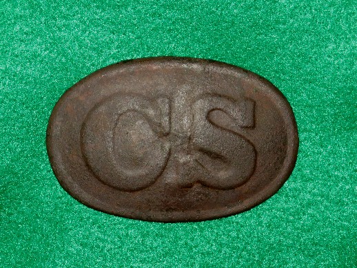 9. Excavated, large Breckinridge pattern, die stamped, CS oval waist belt plate.  This buckle was recovered about 40 years ago along Columbia Pike by Butch Mayes.  It has a smooth chocolate brown patina and all three hooks intact on the reverse.--$3,850.SOLD