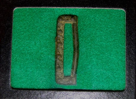 38. Excavated Confederate State Seal wreath with the decorated inner belt loop.  This wreath is correct for several Confederate states such as "Georgia, Virginia, South Carolina, etc.", but this one probably had a "Georgia" in that it was recovered near the camp of the 1st GA. Cavalry.  BUT - If you have any of the states that take this wreath, here is your chance to finish your buckle.  The wreath has a really pretty brown-green patina.--$895.