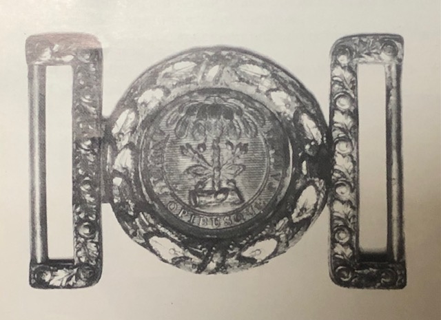 22. Model 1851, N.C.O. (Non-Commissioned Officer) belt with original cast brass sword belt with applied silver wreath intact.  The belt is the early issue pattern with the flat style brass adjustor hook.  The buckle itself has a pleasing, aged patina and is 100% complete.  The belt remains pliable with minimal flaking and could literally still be worn.--$650.
