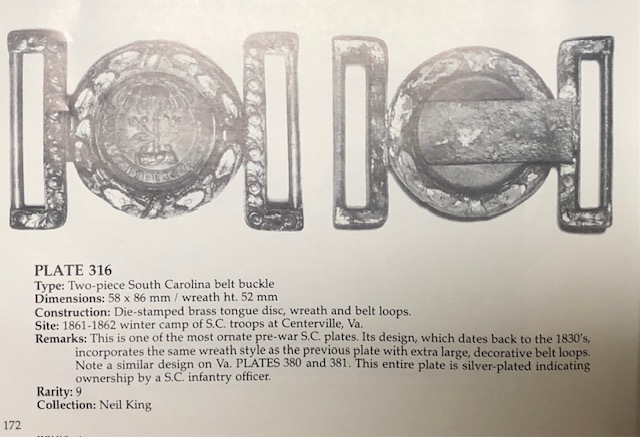 16. SUPER, SUPER RARE, Noble Brothers, Rome, Georgia, Confederate alteration of a US oval cartridge box plate to a Confederate waist belt plate that would have been worn "upside down" to read, "SN" (Southern Nation).  This particular example is THE VERY ONE pictured in Steve Mullinax's, Confederate Belt Buckles and Plates on page 48.  Steve personalized the picture of the buckle in Clint's book "Thanks for the buckle - Steve".  In over 50 years, I have seen less than five of these type Confederate conversions that are NON-EXCAVATED.  This buckle is not only in drop-dead perfect condition with all three applied Confederate hooks intact, but also comes with Steve's original buckle book with the personalization inside.  It does not get better than this.--$1,450.SOLD*
