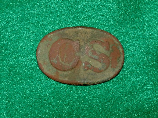 17. Very attractive, excavated, Richmond Arsenal Enlistedman's pattern "CS" two-piece sword belt plate.  This buckle was recovered about 30 years ago from a Confederate Cavalry camp located near Brandy Station, Virginia.  The two pieces were recovered a belt-length apart and fit well with matching patina.  It will be an excellent addition to someone's collection.--$2,250.