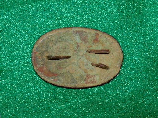 111. Excellent condition, excavated, large size, US oval cartridge box plate.  This plate was recovered here at Stones River about 40 years ago and has never even been washed off.  The face has a smooth, brown/green patina, and the reverse has full lead and both attachment loops intact.--$250.