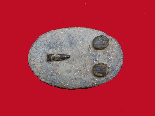 103. Drop-dead beautiful condition, excavated and has never even been washed off, large size, lead-filled, US oval cartridge box plate with full lead and both iron attachment loops remaining intact.  This box plate was recovered from an old oak woods camp near Chancellorsville, Virginia.  Plates this nice are just not being recovered at this point in time.--$250.
