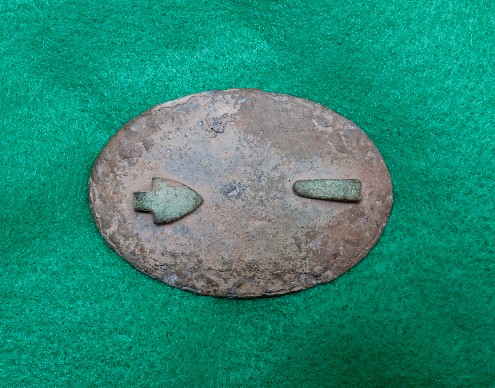 119. Beautiful condition, excavated, lead-filled, large size US oval cartridge box plate.  This plate was recovered many, many years ago on private property here at the Battle of Stones River.  You couldn't ask for a more beautiful excavated cartridge box plate.  The face has a near reflective brown/green patina, and the reverse has full lead with both iron loops remaining perfectly intact.  This is a beauty!!!--$250.