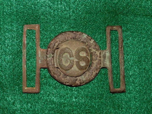 30. Absolutely beautiful condition, excavated, Richmond Arsenal pattern "CS" tongue and wreath sword belt plate.  The two pieces were dug together by Jerry Headley approximately 40 years ago.  The buckle was recovered from a Confederate Cavalry camp located near Brock Road at the Battle of the Wilderness.  This buckle is a beauty and remains just as dug with no repairs whatsoever.  They just aren't being dug this nice anymore.--$3,250.SOLD