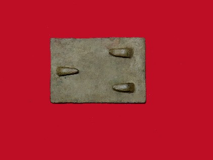 20. Excavated, stamped brass, plain face, rectangular, Confederate waist belt plate.  These are recovered from early war Confederate sites.  It is quite rare to recover one of these with most of the iron frog hooks still intact on the reverse.  My very first Confederate plate to recover back in 1969 was a plain face rectangle just like this one.  I recovered it from a Confederate camp site near Chickamauga, Georgia.  This is a really nice example.--$375.