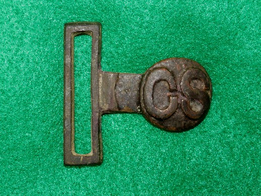 92. Very pretty, non-excavated, brass belt adjustor off a regulation Civil War issue US belt rig.  These are difficult to come by when you need one.  If you have a nice US belt rig but missing the brass adjustor, here's your chance.--$48.