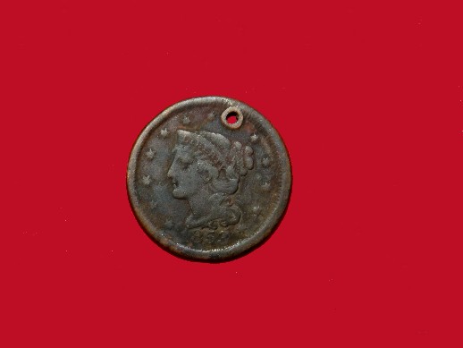 3. Excavated, 1853 large cent with a small hole where the soldier had been wearing it as a necklace.  The coin still retains nice detail and a crisp easy to see date.--$25.SOLD