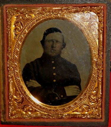 59. Very attractive fully cased 1/9th plate tintype of a standing Federal Infatryman wearing his 9-button Federal Enlistedman's frock coat, and his belt rig with the cross belt strap.  The waist belt plate is gilted, but I would sure like to see it.  This is an early war image, and is out of Ohio.  I could just see that as being a large "O.V.M." !!  Just a good solid image with belt and buckle, cross belt, cap box, frock coat, kepi, and musket with bayonet.  He is ready to head for the front !!--$325.