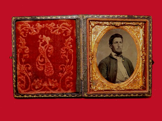67. Fully cased, 1/9th plate "ruby ambrotype" of Jacob Sampson Gibson - 1861.  There are a couple of different candidates for which unit Jacob was in, but a little research will likely unravel it.  It is a nice, clear image in an excellent condition thermoplastic case by "S. Peck & Co. Union Cases".  This will make an excellent addition to someone's Civil War display.--$225.