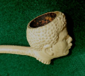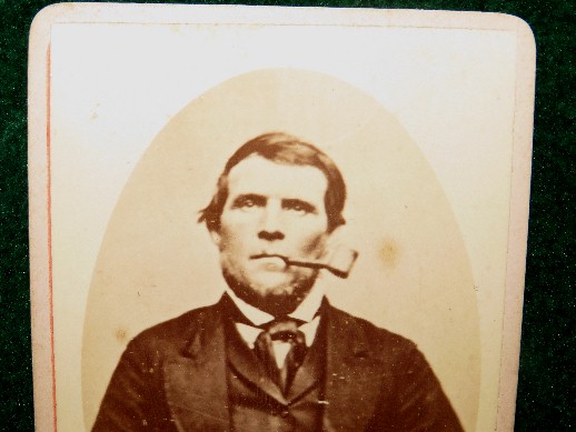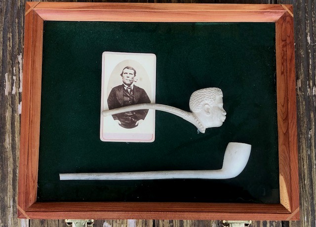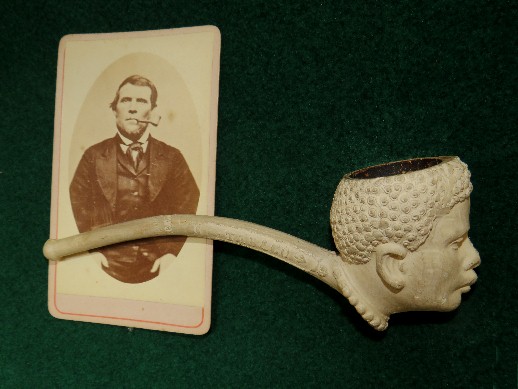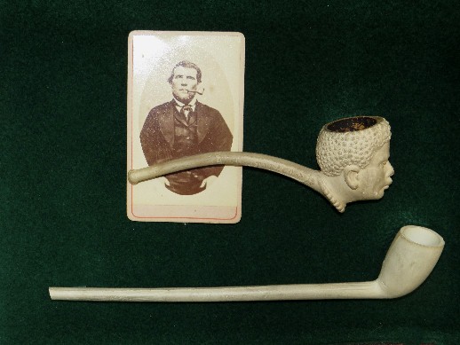 1. Beautiful condition, rare Civil War pipe display.  In this display is a CDV of a Civil War Era gentleman smoking a pipe of this type.  One of the two pipes in the display is an extremely rare pipe fashioned after a young Negro boy's head.  You smoke out of the top of his head.  The other pipe is your typical, glazed white clay pipe of the era except it has a SUPER LONG, unbroken stem.  This display would, without question, be the centerpiece of a Civil War smoking pipe display.  It is displayed in a deep, black walnut display case on green velvet.--$395.