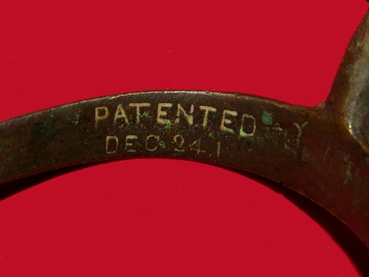 6. Beautiful excavated condition Federal Officer's spur.  This style spur is often referred to as the "Christmas Eve Spur" as it is marked on the interior of the spur, "Patented Dec. 24, 1861".  This example has a pleasant brown/green patina with the rowel made from a large cent.  It was recovered many years ago from an 1863 Federal Cavalry camp just west of Triune, Tennessee.  This is an exceptionally nice example.--$250.SOLD