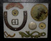 180. Very pretty "Cavalry display" recovered from various Federal Cavalry camps around Murfreesboro, Tennessee.  The display consists of a partial saber scabbard, two cast brass spurs, one beautiful coat size gilted Federal Cavalry button, three silvered rosettes, a cast brass saber hanger, one brass powder flask, and several Cavalry projectiles.  The entire display is presented in a well-made wooden case.--$350. for the entire display including display case.
