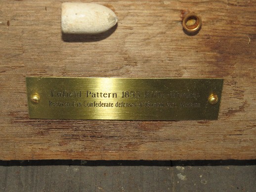 190. Very attractive, excavated group of Enfield related items recovered from Confederate Army of Tennessee camps along Duck River near Shelbyville, Tennessee.  The display includes two Enfield nipple protectors with chain, one complete brass Enfield tompion, one drop Confederate mold, .577 cal. Enfield bullet, and one excellent condition and quite rare Isaac Campbell Confederate knapsack hook.  Entire display in a glass display case.--$150.