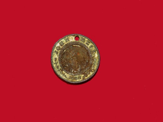 151. Excavated, stamped brass hat device (1), I think.  This hat device, I believe, could possibly be a number of different things.  It could be a (1) as it appears to be, or it could be one leg of an (H), or a stamped brass (I) missing one tip, or other possibilities I'm sure.  Whichever it is, it is --$25.SOLD