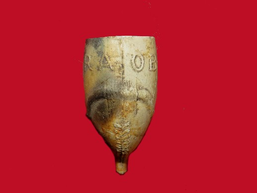 23. Excavated, glazed white clay pipe with a "bull" on the face of the pipe and the initials "RAOB" on the face.  This one is out of a Confederate trash pit near Shelbyville, TN.--$48.