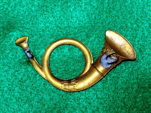5. Excellent condition, non-excavated, stamped brass, "French Horn" Federal Infantry hat pin.  Both attachment loops remain perfectly intact.--$125.