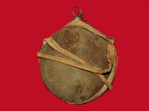 217. Original, smooth type, Model 1858, Civil War canteen with complete butternut cover as well as the original stopper and chain.  It is becoming rarer and rarer to find Civil War canteens with their wool covers remaining intact.--$250.