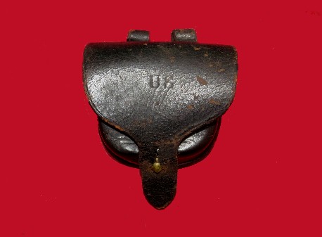 238. Small leather Civil War era Pistol cartridge box correct for .44 cal. revolver ammunition.  The box remains in nice condition with pliable leather, and is only missing the tip of the leather closure tab.  This would be a perfect compliment to display with your .44 cal. Colt or Remington Army revolver.--$175.