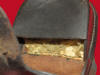 242. Absolutely beautiful condition, private purchase, cast brass, Confederate used cavalry spur.  Over the years, we have recovered several spurs of this type, and every one has come from Confederate Cavalry sites.  This example has a rich, aged patina and a large, handcrafted, copper rowel that was made from a coin.  A small portion of the original leather boot attachment strap remains with the spur.--$295.