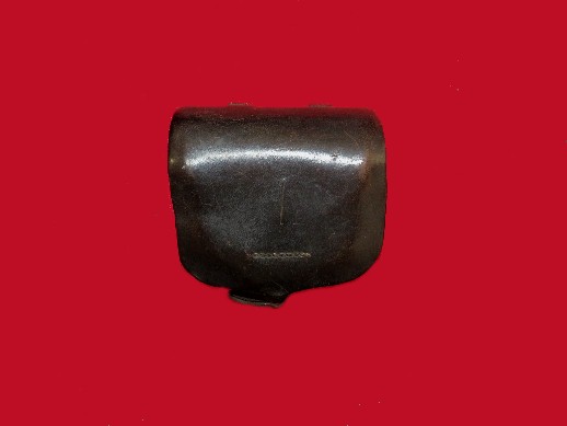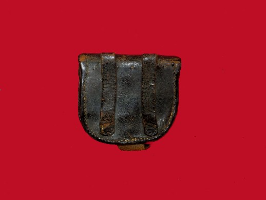 259. Small black leather pistol cartridge box for .36 cal. revolver cartridges.  The box remains quite pliable with both belt loops remaining intact on the reverse.  The small leather closure tab is not present and appears to have been intentionally removed long ago.  This would be an excellent compliment to display with your .36 cal. Colt Navy revolver.--$225.