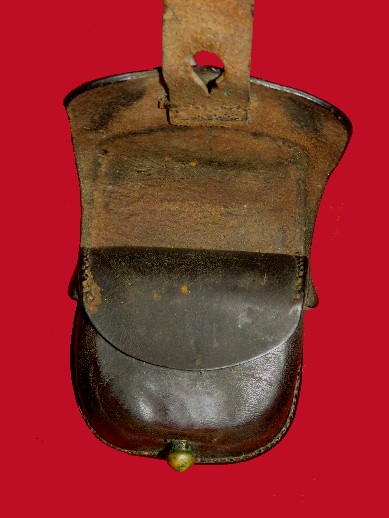 43. Really nice CONFEDERATE CARRIED, but Union produced .58 cal. leather cartridge box.  The box is out of this local area, and has the "upside down" U.S. cartridge boxplate meaning "SOUTHERN NATION".  It remains in very nice soft, pliable condition, and still has the Confederate produced one piece cartridge tin still inside - just as it was carried.  This is a first class box with both belt loops intact - original plate intact - closure tab in place - and Confederate one piece cartridge tin.  You really should wear "ear protection" when handling this artifact BECAUSE "DIXIE" IS PLAYING SO LOUD !!!!!!--$895.