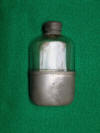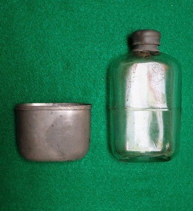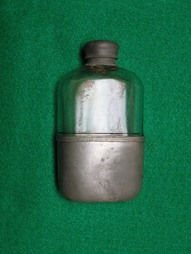 72. Excellent condition, small size Officer's whiskey flask.  This flask has the leather covering intact on the top and the removable pewter cup intact on the bottom.  The threaded pewter cap remains perfectly intact.  (Could possibly come with a small amount of Tennessee moonshine!!)--$125.SOLD