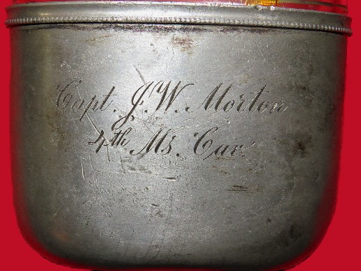 11. Civil War Era, 5 1/2 inch, glass whiskey flask with pewter cup on the bottom and pewter cap on the top.  This flask is out of the South, and the pewter cup portion is engraved, "J. W. Morton - 4th MS. Cav."  I really wanted this to belong to Capt. John West Morton, Chief of Forrest's Cavalry Artillery, but the "4th MS Cav" suggests that it is a different Confederate Officer.  It is still a super cool artifact, and I would really appreciate, if anyone can unravel who this Confederate Officer is, please let me know!!--$350.SOLD*