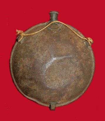 1. Quite rare St. Louis Arsenal style Model 1858 tin canteen.  This canteen was found in an old barn near CHAMBERSBURG, PA, and was no doubt left from The Battle of Gettysburg, PA.  It was purchased many years ago from a Relic Shop in Gettysburg, and has for many years been on display in the private museum in Lowell, Ark. owned by Ann and C. W. Webb.  St. Louis Arsenal Civil War canteens are quite rare on their own, but even more rare being from Gettysburg.--$295.