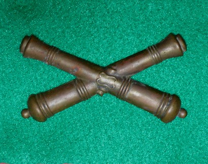 4. Rich chocolate brown aged patina on this die-stamped brass, crossed cannons Federal Artillery hat pin.  This set of crossed cannons could actually pass as being an excavated set, but I believe in reality it is a darkly patinaed set of non-dug crossed cannons.  The attachment loops are not present, but you can see where they once were.--$195.