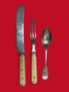 12. Beautiful 3 piece Civil War eating utensil setting.  Now - The Cool Part !!!  The SILVER spoon is "HYDE AND GOODRICH" marked !!!!  "HYDE AND GOODRICH" is famous for the MANY UNIFORM BUTTONS THEY SUPPLIED TEXAS AND MISSISSIPPI !!!  They were located in NEW ORLEANS, LOUISIANA !!!--$195.