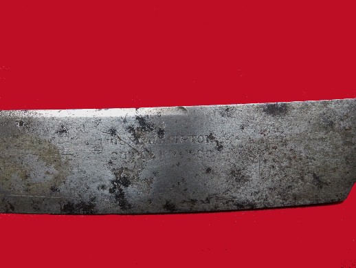 218. Very nice condition, straight razor of the typical ones used in the Civil War.  Markings on this straight razor, however, suggest this example dates about 1890.  Still, it displays very nicely in a camp scene display.--$25.