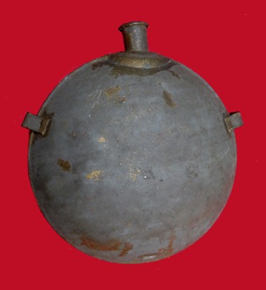 1. Nice condition, Model 1858, tin spout, St. Louis Arsenal canteen.  This type canteen turns up in both Union and Confederate estates.  This example has some traces of old blue and gold paint very typical of artifacts found on display in UCV and GAR meeting halls.  This example remains in nice condition and is missing only one sling glide on the bottom.--$150.
