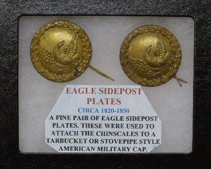 1. Excellent condition, non-excavated pair of Shako side plates.  The plates have a Militia style Eagle on each and attaching wires remain intact on both.  These were slightly pre-Civil War but were carried over into the Civil War Era.  We do recover them from Civil War sites.  For the pair--$150.